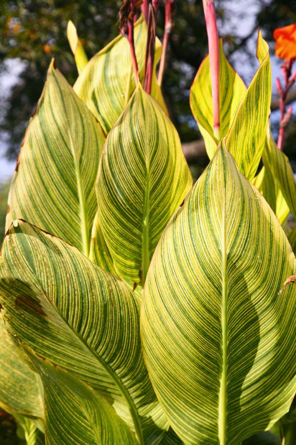 - Canna ‘Tropicanna’: Known for its striped orange, pink, and green foliage and orange flowers.